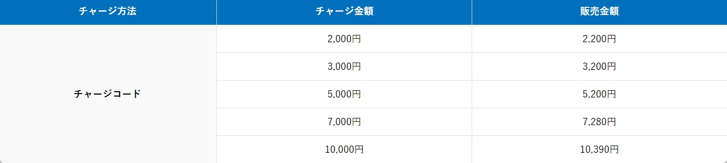 チャージコードは2000円、3000円、5000円、7000円、10000円から選べ、購入時に手数料がかかります。