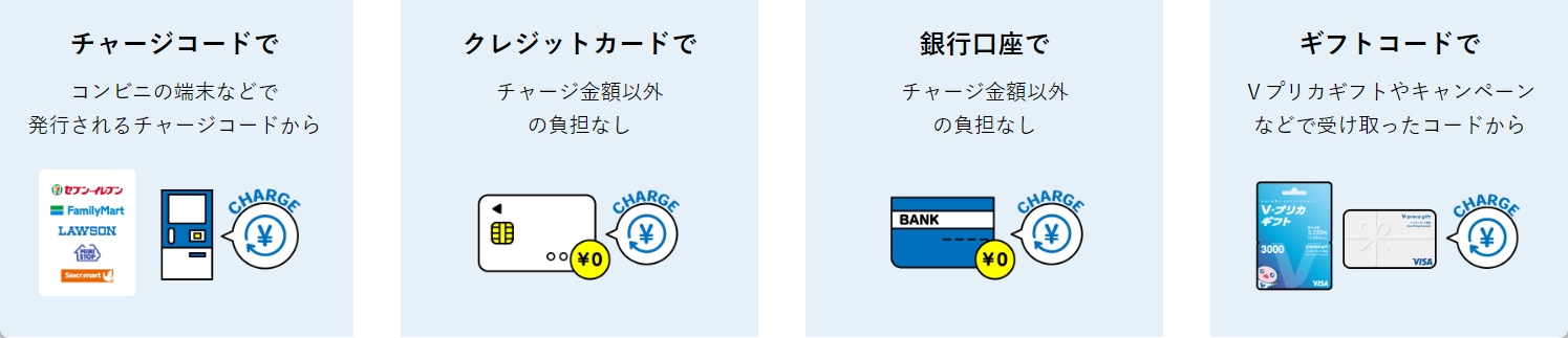 Vプリカへのチャージは、コンビニ端末で購入したチャージコード、クレジットカード、銀行振込、ギフトコードのいずれかで行います。ここでは、コンビニでのチャージコードの利用方法を例に挙げます。ここでは誰でも利用できるココンビニでのチャージコードを例にしてチャージ手順をを解説します。