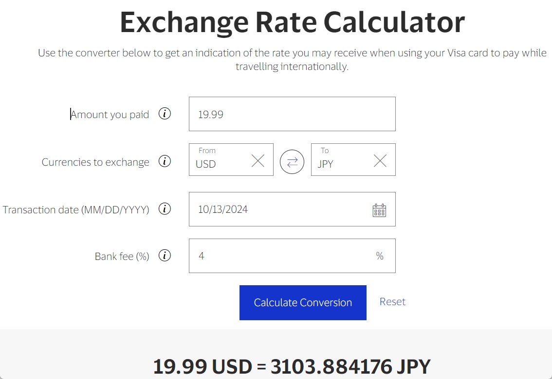 Hey動画見放題プランは海外サイトでドル決済です。それに加えてVプリカでドル決済を行うと海外手数料が発生します。その為、チャージ金額がわかりづらいですが下記のVisaのシュミレーターを使えば請求額をシュミレーションできます。