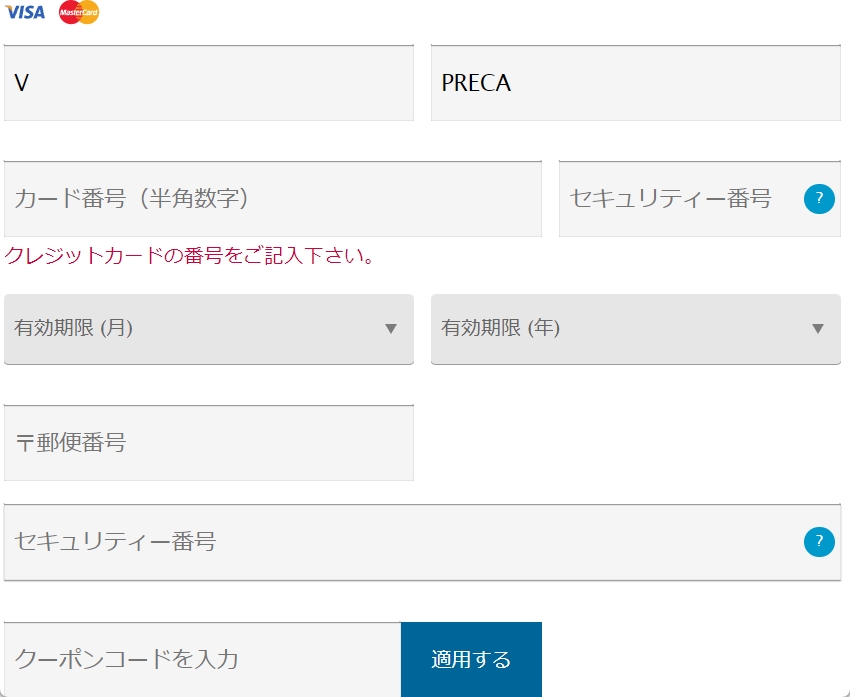 名前は画像左下の「VPRECA」を適当なところで区切り入力します。郵便番号、Vプリカの有効期限とセキュリティーコードをそれぞれ入力し同意のボックスにチェックを入れて「購入する」を押下。問題なければ購入完了画面が表示されます。登録したメールアドレスに「購入確認」のメールが届きます。