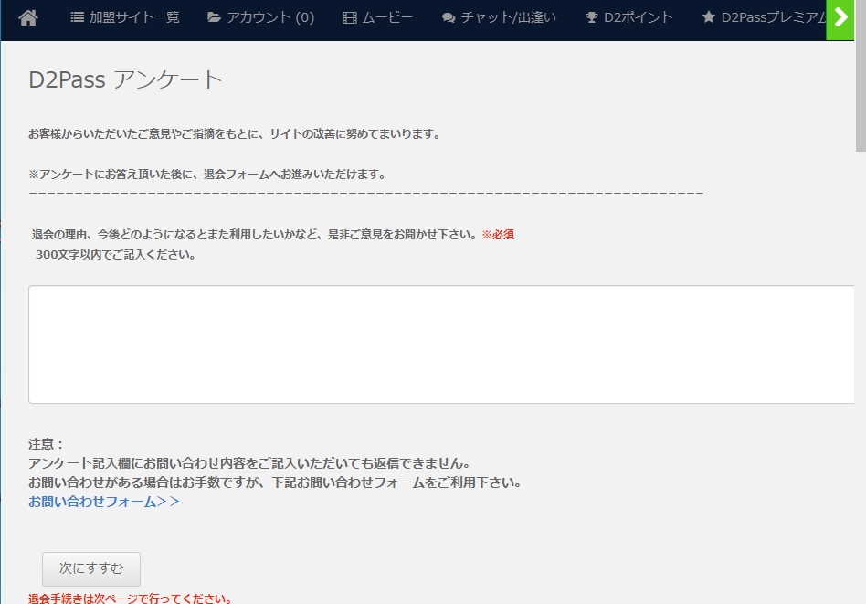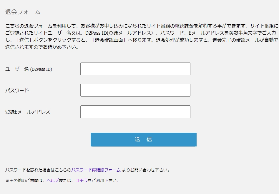 アンケートの入力後、D2Pass IDとパスワード、登録したメールアドレスを入力し、「送信」ボタンをクリックします。画面が「退会手続きステップ2」に切り替わりますので、問題がなければ「退会処理」をクリックして完了です。