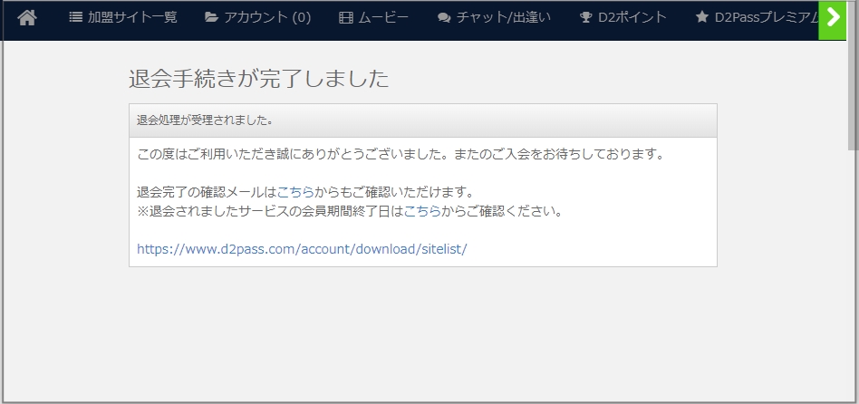 退会手続きが完了すると、D2Passアカウントと登録メールアドレスに退会完了確認メールが届きます。
